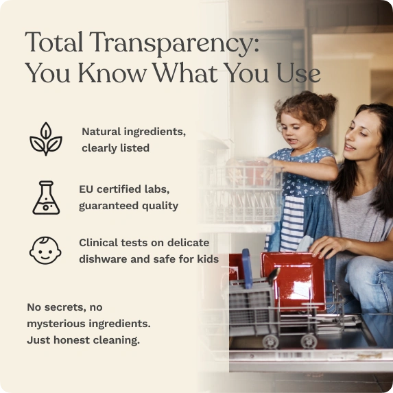 "Il profumo è così leggero e gradevole: piatti puliti, senza alcun odore chimico. I miei bicchieri escono scintillanti e anche il grasso più ostinato è sparito. Inoltre, la confezione senza plastica fa un bell'effetto nella mia cucina e non occupa spazio. Un upgrade davvero intelligente e sostenibile!"